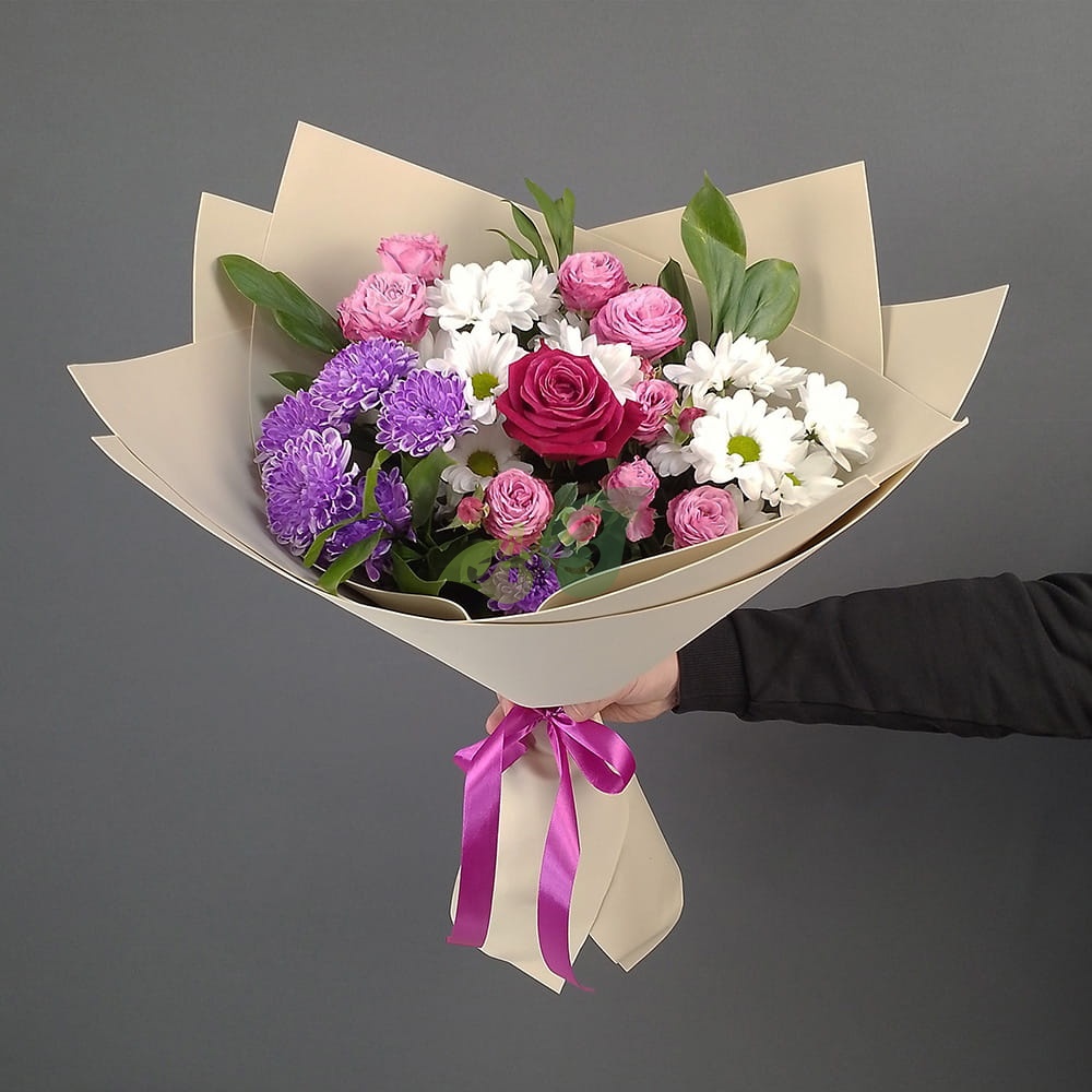 Сборный букет из кустовых роз и хризантем – это недорого и красиво. Такие цветы можно покупать для разных праздников и вовсе без повода.