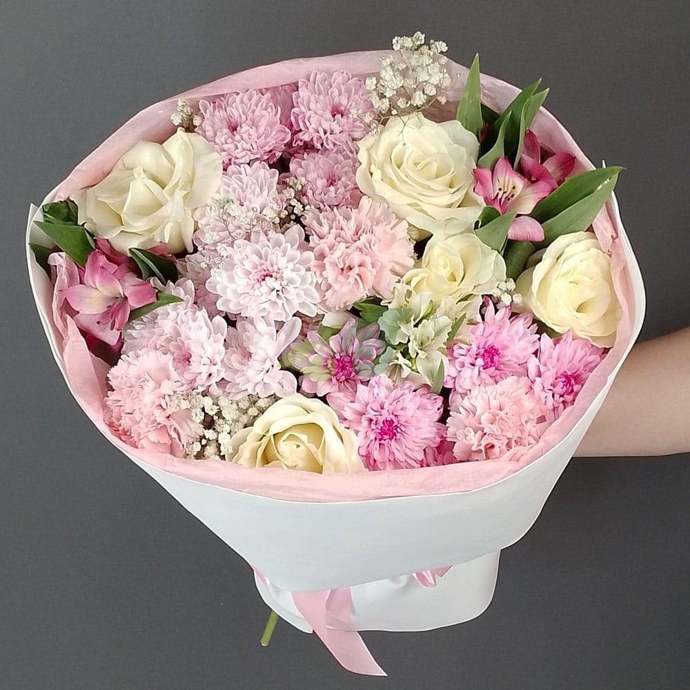 Этот букет из разных живых цветов можно дарить всем: и привередливой красавице, и строгой начальнице, и милой маме, и заботливой бабушке. Перед ним невозможно устоять. Но главное, что он не требует дополнений в виде подарка. Ведь этот букет и сам по себе шикарный подарок.